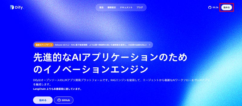 右上の「始める」ボタンをクリックしてGoogleアカウント、GitHubアカウント、メールアドレス登録のいずれかでサインインします。