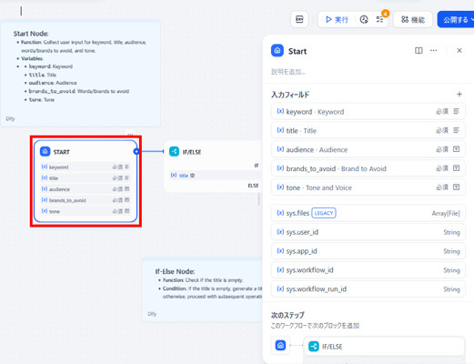 テンプレートを選択するとノード形式でアプリの作成画面が開きます。