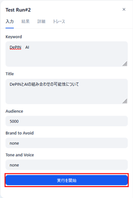 構成ノードの設定が終わったら右上の実行ボタンをクリックしてアプリが動作するのかを検証します。