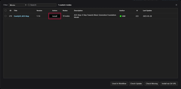ノードが足りない場合は「ComfyUI-Manager」の「Install Missing Custom Nodes」に進み、不足しているノードをインストールします。