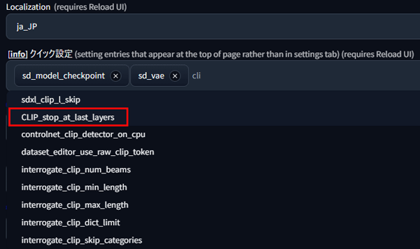 クイック設定で「CLIP_stop_at_last_layers」を検索してチェックを入れます。