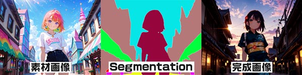 ControlNet Segmentationは、画像を「人物」「背景」「建物」などの領域ごとに分割して扱える機能です。