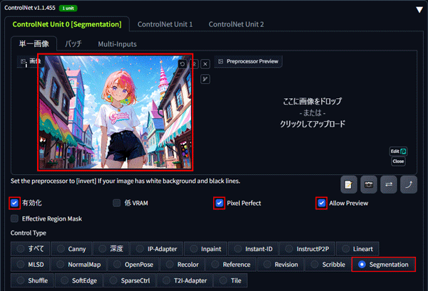 ControlNetのSegmentationを開き、ドラッグ&ドロップで素材画像を読み込みます。