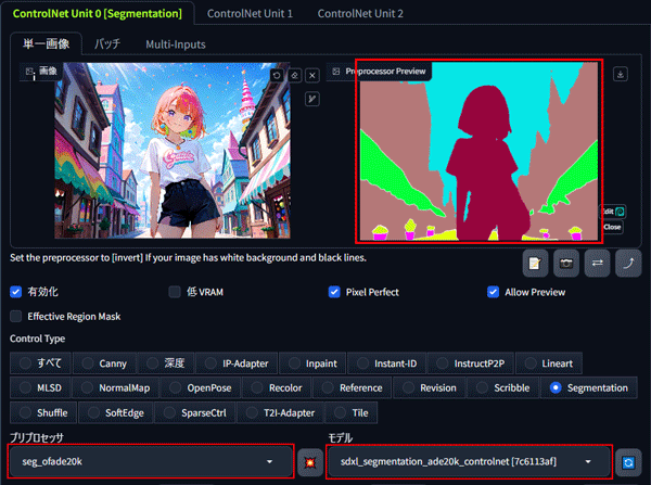 次に、プリプロセッサ「seg_ofade20k」、モデル「sdxl_segmentation_ade20k_controlnet」を選択します。