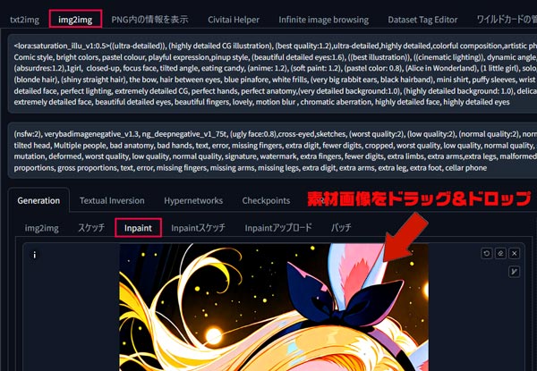 img2imgタブからInpaintを開いて素材画像を読み込みます。