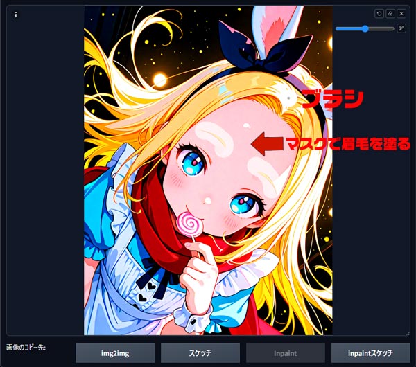 まず、画像編集画面で修正したい眉毛の部分をブラシで塗りつぶし、マスクを作成します。