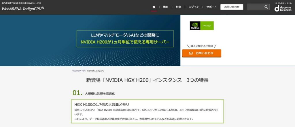 WebARENA IndigoGPUは、NTTPCコミュニケーションズが提供するGPUクラウドサービスで、NVIDIA H200GPUを搭載したGPUインスタンスを低コストで利用できるIaaS型のサービスです。