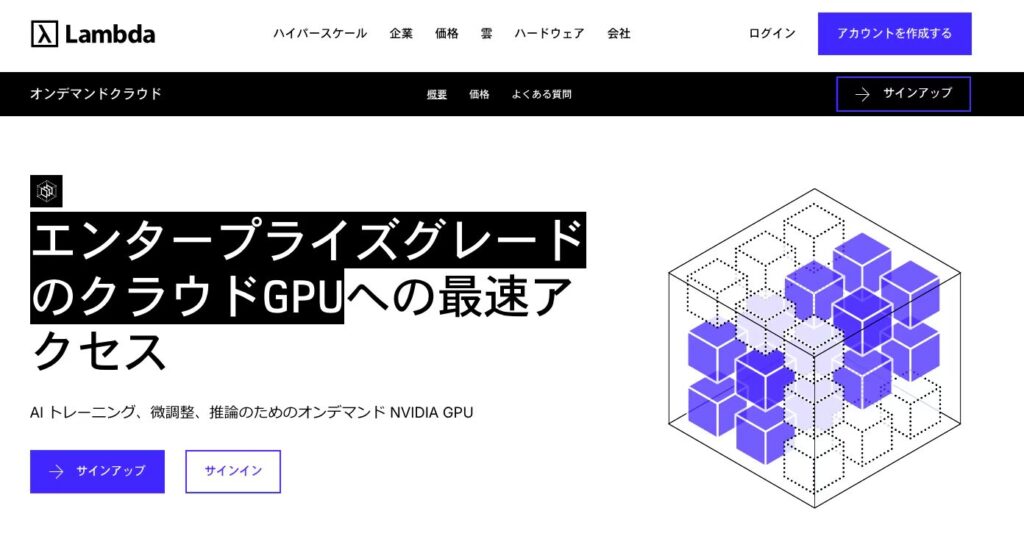 Lambda GPU Cloudは、特にAI(人工知能)や機械学習、大規模言語モデル(LLM)のトレーニングに特化したGPUクラウドサービスです。