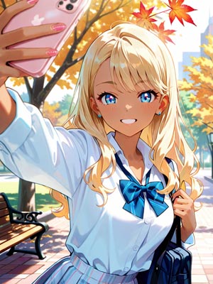 「selfie」というキーワードを軸に、キャラクターの表情や視線、背景などを指定していくのが基本となります。