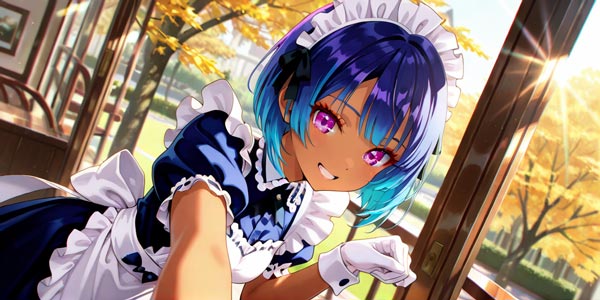 「ornately frilly maid」(フリルのメイド服)、「purple eyes」(紫の瞳)、「paw pose」(猫のポーズ)といった小物を加えることで、キャラクターの魅力は一層引き立ちます。