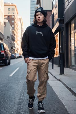 Stable Diffusionでカジュアルな服装を描くには、「hoodie」「t-shirt」「jeans」「sneakers」といった基本アイテムの組み合わせが最も効果的です。