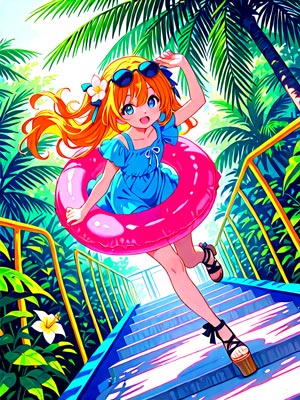 次にtropical beachやEuropean cobblestone streetなどの夏らしい背景と、straw hat・sunglasses・monstera leavesといった季節小物を添えることで画面全体の夏感が一気に高まります。