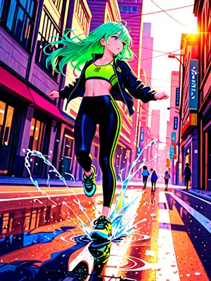 さらに shallow depth of field with focus on sneakers(靴にピント+背景ボケ)や wet asphalt reflection(濡れた路面の反射)といった演出を加えることで、自然と視線が足元に集中する画像になります。