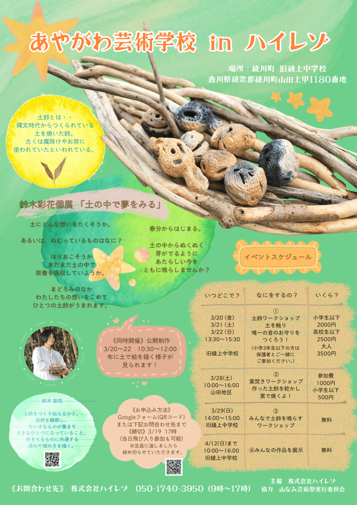山なみ芸術祭実行委員会との共催にて、香川県綾川町で土鈴を活用したワークショップ「あやがわ芸術学校 in ハイレゾ」を開催します。